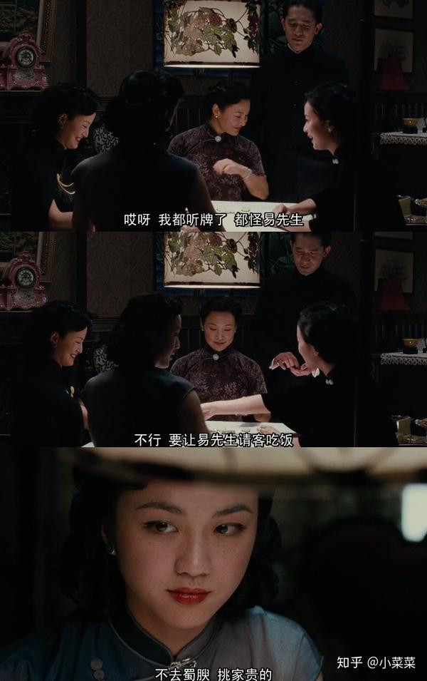 王佳芝的低调,一是出于心理上的,因为自己没有钻戒,不宜过多讨论此话题。二是她对易先生有情爱的成分在,看他跟别人眉来眼去的,多少不是滋味。而第三点,则是她接下来要去实施暗杀他的计划了,心理上的煎熬。鹬蚌相争,渔翁得利。易先生到来后,三个与他有关系的女人各生心思,牌局上的氛围突变,所以易太太说他搅局一点也没错。专心打牌只想着输赢的梁太太丝毫不受影响,居然胡牌了,一群人嚷嚷着喊易先生请吃饭。为什么梁太太胡牌了,易先生请吃饭?提出这个建议的是马太太,她借着易先生的到来为自己找回丢失的面子,也是暗示自己跟易先生的关系不一般,能够让他答应自己的要求,同时还狠踩了一下王佳芝,「不去蜀腴,挑家贵的。」