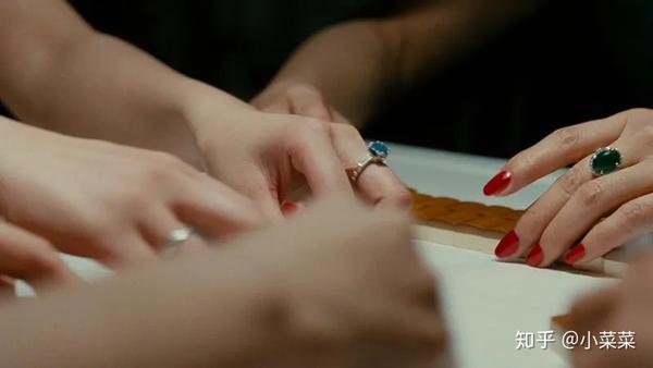 此时,麻将桌上正在讨论钻石的话题,一是点题,二是为后面的粉色鸽子蛋做铺垫,有了这段戏的解释,我们才能明白,易先生送出鸽子蛋,给无依无靠的王佳芝带来多大么的心理的冲击,以至于她最后喊出了那句「快走」。阔太太们聊黄钻、火油钻,又问马太太的钻戒是几克拉的,夸她的钻戒好。这里有个很有趣的地方,易太太原本在跟马太太斗气,现在在易先生面前,倒是一派和谐融洽的样子。但是马太太刚好相反,此时斗志昂扬,「我这只好么?我还嫌它样子老了。」假装谦虚,但语气里满是骄傲,还偷偷瞥易先生。