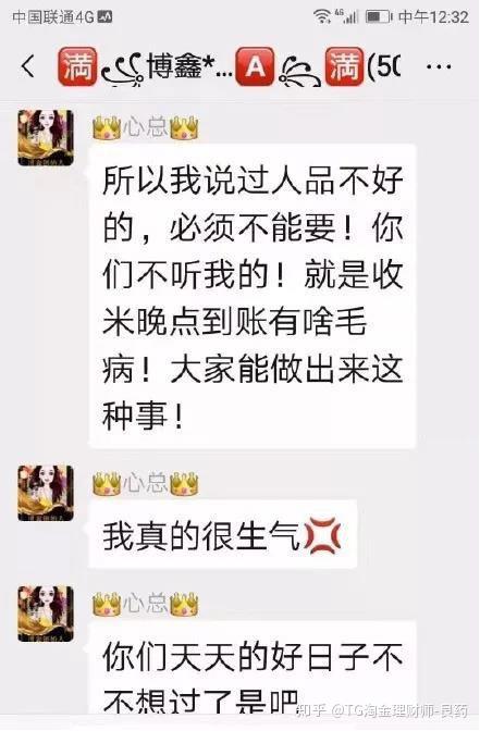 头目“心总”博鑫群发言截图然而,心总还在群里忽悠:我说过人品不好的,必须不能要!你们不听我的!就是收米晚点到账有啥毛病!大家能做出这种事!我真的很生气,你们天天的好日子不想过了是吧!