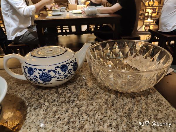 流程就是,服务员拿上一壶热茶以及一个装“脏水”的盆子,然后我们各自拿热茶冲洗餐具然后再倒到盆里。